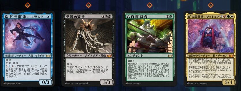 - 大量の2マナ域もとにかく押すしかないのでド序盤から止まらず展開する目的では良かった、欲を言えば3マナ域に《集まる群衆》が欲しかったが…(1枚しかピックできず無用の長物に)
