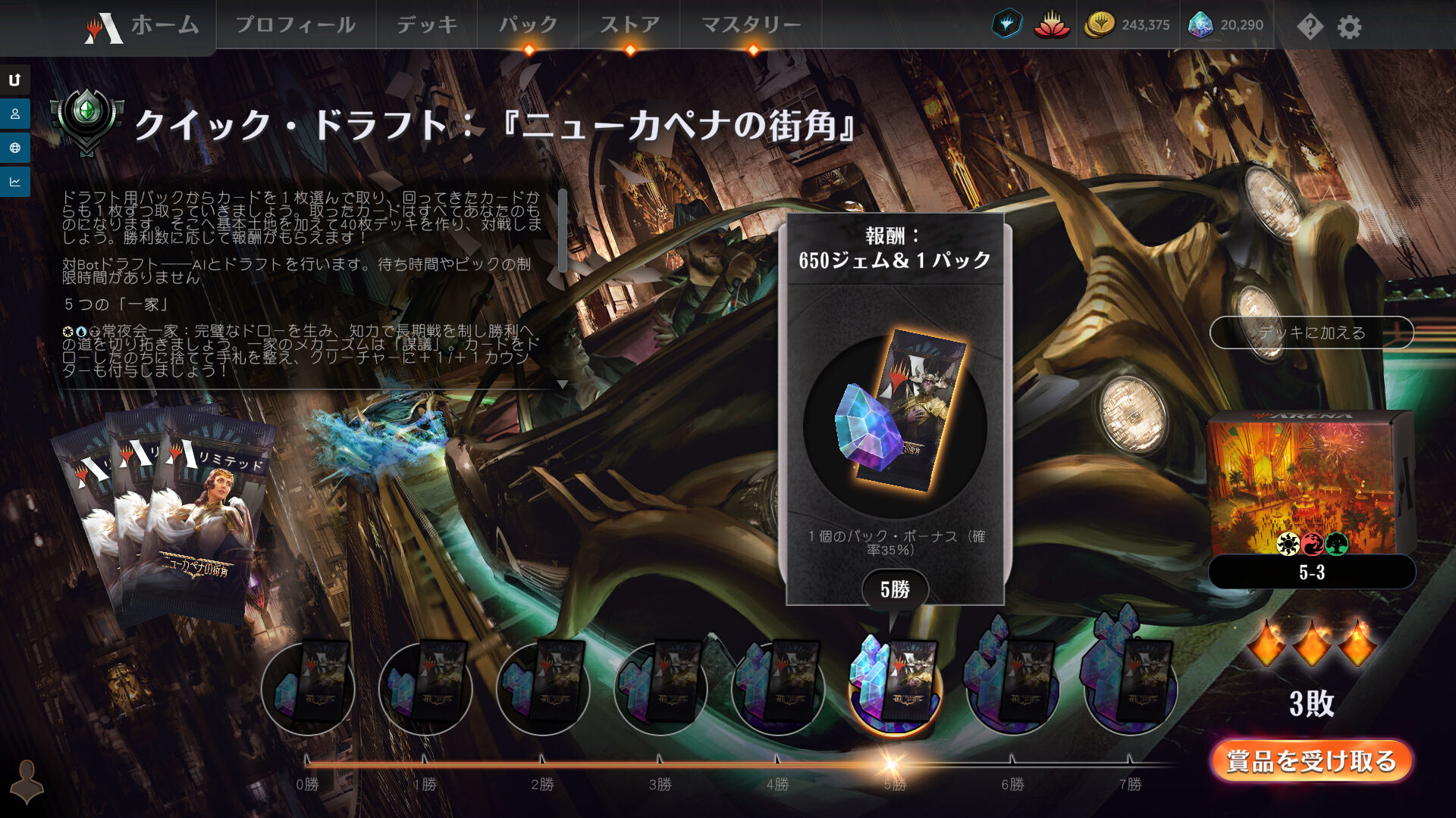 SNCのレア取りドラフト、第5回は5勝で終了(サムネはツールの不具合なのか4勝扱いに…)