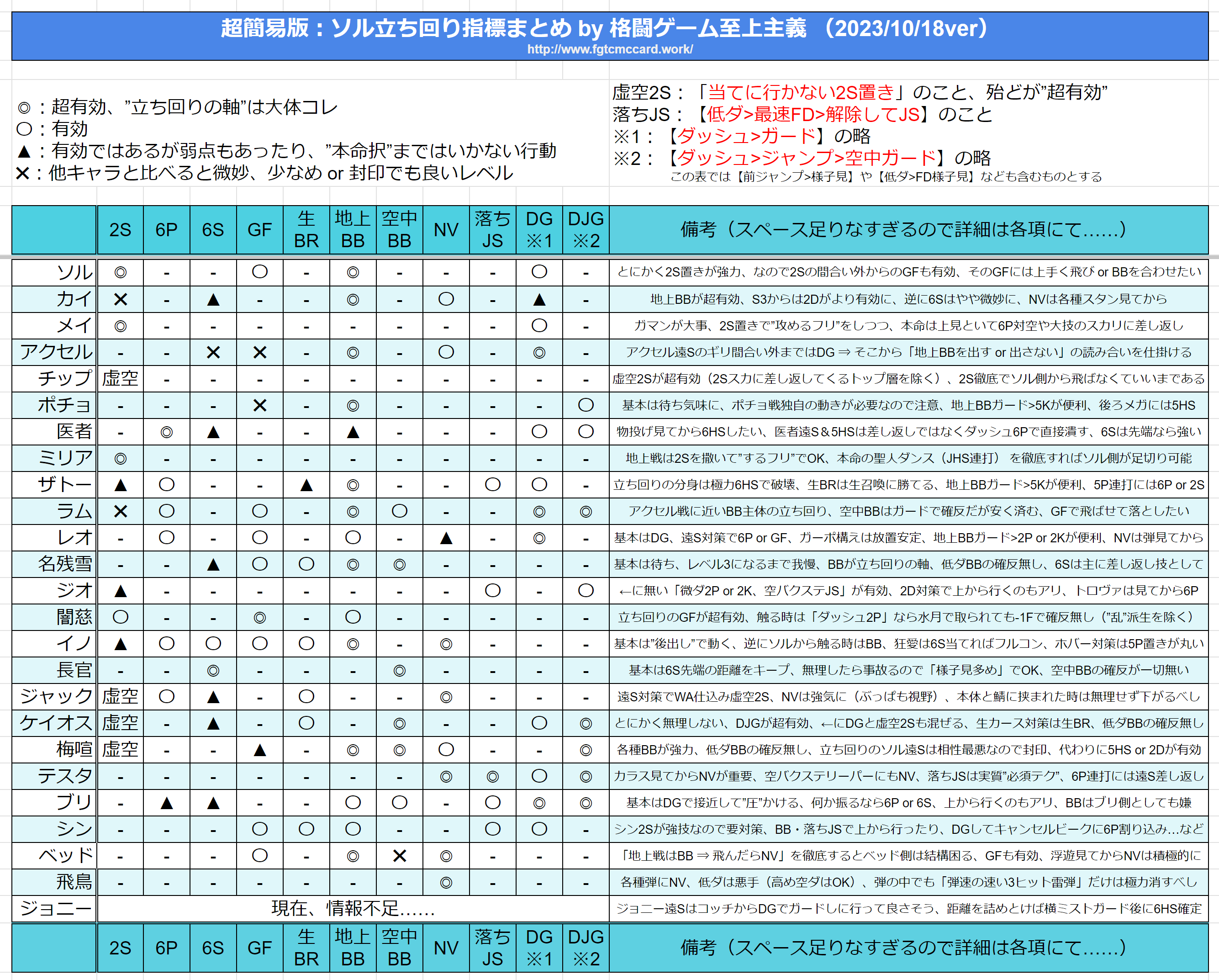 ※2023/09/28:「超簡易版:ソル立ち回り指標まとめ」を追記修正、ポチョ・長官対策を追記修正、飛鳥・ジョニー対策を(簡易版ながら)追加